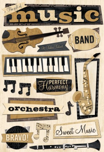 High quality cardstock stickers that were created for discerning scrapbook, greeting card, and paper crafters. Features: 15 stickers depicting musical notes, violin, coronet, keyboard, and titles, quotes, and banners. Stickers measure from 1/4″ to 5-3/8″ Colors: brown, tan, cream. Acid and lignin-free, and archival safe. Self adhesive