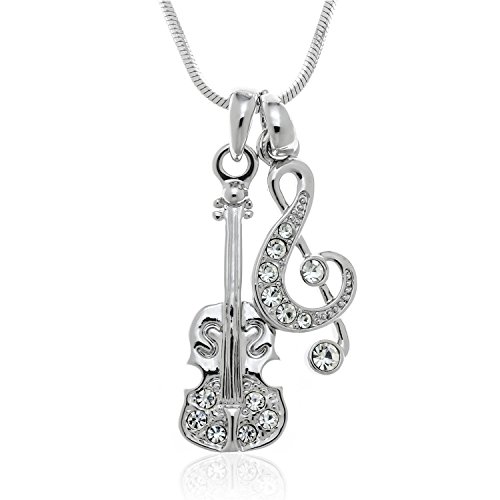 Here is a sweet clear crystal double pendant necklace. You will find two cute charms on this necklace: a violin and a treble clef. This piece will be perfect for the music lover in your life! It comes on a thin 17″ long silvertone chain necklace with a lobster claw clasp and 1 1/4″ extension.